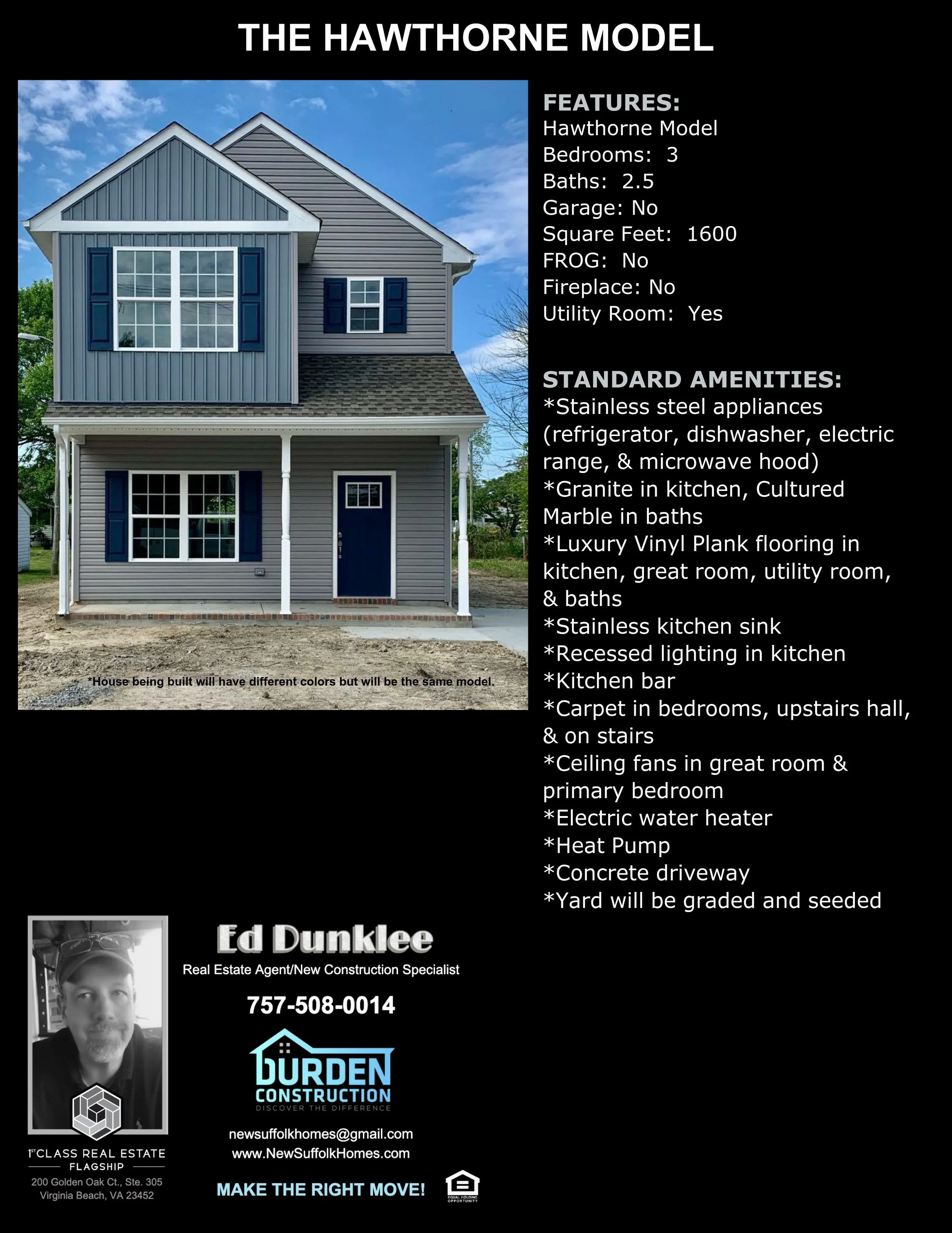 This is our Hawthorne Model with 3 bedrooms, 2.5 baths, and 1600 square feet. Granite countertops, stainless appliances, wide plank flooring, recessed lighting, and custom moldings and finishes throughout. Choose flooring, granite, cabinet finish, carpet color, vinyl siding, shutters, and front door color. Price reflects base model...any upgrades are additional. Let me show you how easy it is to build your dream home with us!