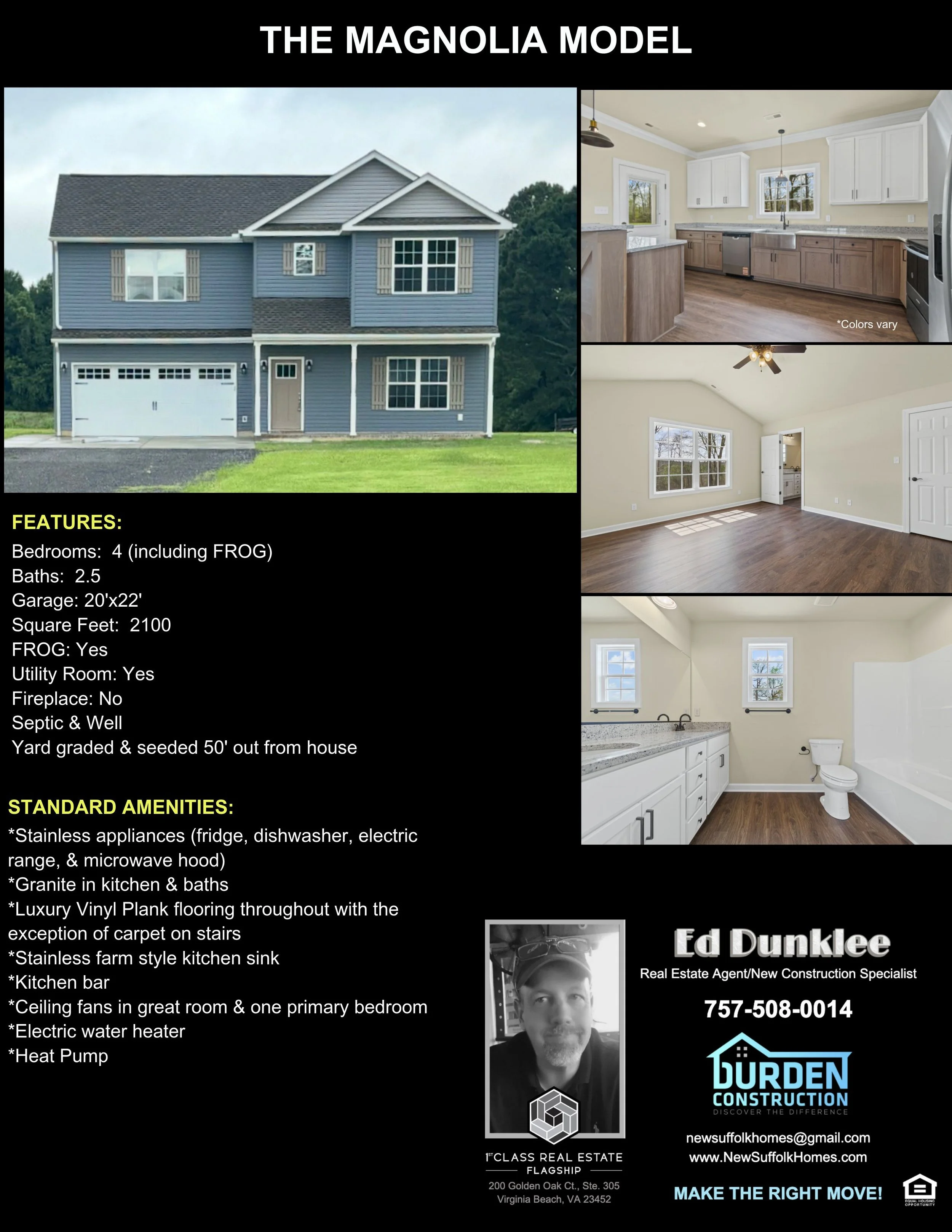 This is our Magnolia Model with 3/4 bedrooms (finished room over garage can be 4th bedroom or family room), 2.5 baths, and 1900 square feet. Granite countertops, stainless appliances, wide plank flooring, and custom moldings and finishes throughout. Choose flooring, granite, cabinet finish, carpet color, vinyl siding, shutters, and front door color. Let me show you how easy it is to build your dream home with us!