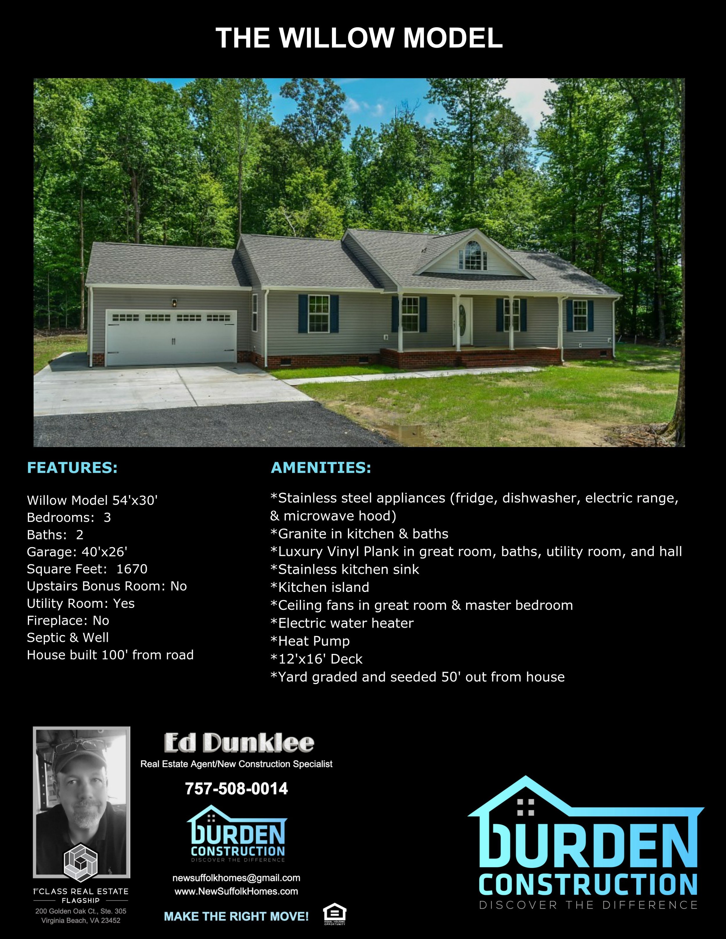 Looking for acreage in the country? Look no further! Our Willow Model has 3 bedrooms (possibility of 4, inquire), 2 baths, and 1690 square feet. This ranch style home has a modern open floor plan with cathedral ceilings in the great room/kitchen with lots of wide open space for family gatherings. Granite countertops, stainless appliances, wide plank flooring, recessed lighting, and custom moldings and finishes throughout. Choose flooring, granite, cabinet finish, carpet color, vinyl siding, shutters, and front door color. Price reflects base model...any upgrades are additional. Let me show you how easy it is to build your dream home with us.